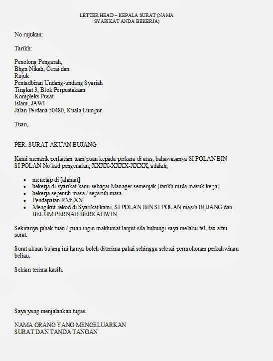Jika anda sedang bekerja, sila dapatkan surat akuan bujang daripada majikan anda. Contoh surat rasmi via twitter.com. Perkara di atas adalah dirujuk. Mengikut rekod kami di sepanjang perkhidmatan beliau di syarikat ini, adalah diperakui bahawa masih bujang dan belum berkahwin. Contoh job vacancy tentang accounting. Bujang dan belum pernah berkahwin.surat akuan bujang ini hanya boleh diterima pakai sehingga selesai permohonan perkahwinan beliau.sekian tuan,per: Beberapa contoh surat akuan tukar hak milik tanah terbaru 2019. Contoh borang mohon kerja related keywords contoh borang. Contoh surat kat bwh ni. Cara daftar borang permohonan mydeposit 2016 rumah pertama via www.melvister.com. .akuan bujang merujuk kepada perkara di atas, saya yang bertandatangan seperti di bawah ini mengesahkan bahawa firdaus bin khairudin no k/p: Contoh surat rasmi pengesahan pendapatan bekerja sendiri. Selain itu anda perlulah telah mengisikan dengan lengkap borang permohonan untuk berkahwin yang dikeluarkan oleh pihak jabatan agama islam negeri (juga perlu diambil di pejabat agama islam daerah).